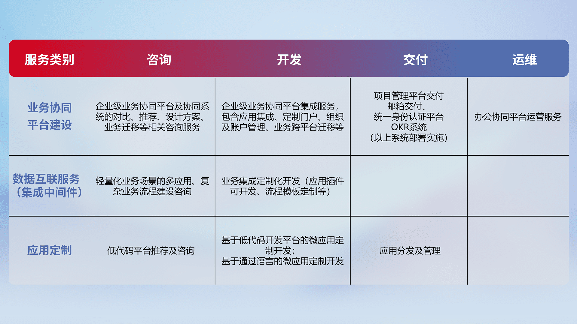 针对钉钉、、、、企微、、、IDaas等平台级产品提供产品的规划、、方案、、、交付、、、定制化开发等服务,,实现如统一协同办公、、智能客户服务、、混合会议管理、、智能数据查询、、等业务场景,,实现数字化转型。。。。